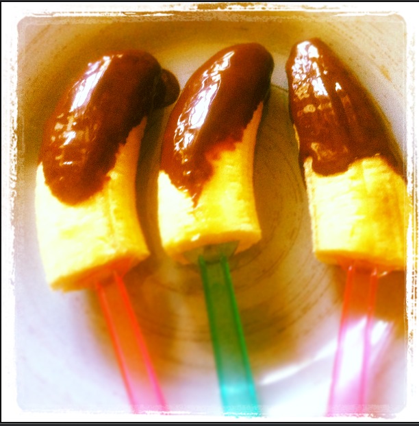 אני מקפיאה בננות לאחר שאני משפדת אותה עם כפית קטנה חד פעמית, מאלו שמוכרים באריזות גדולות לאכילת גלידה
