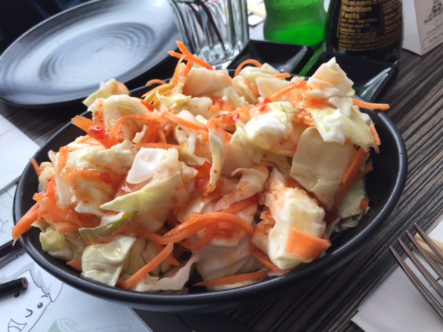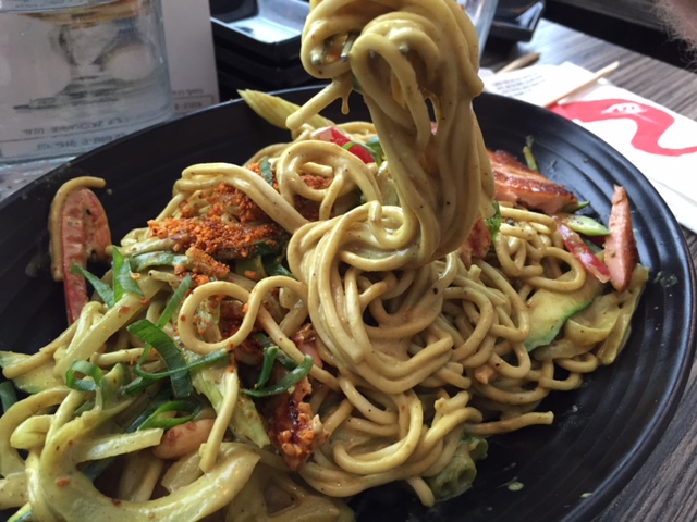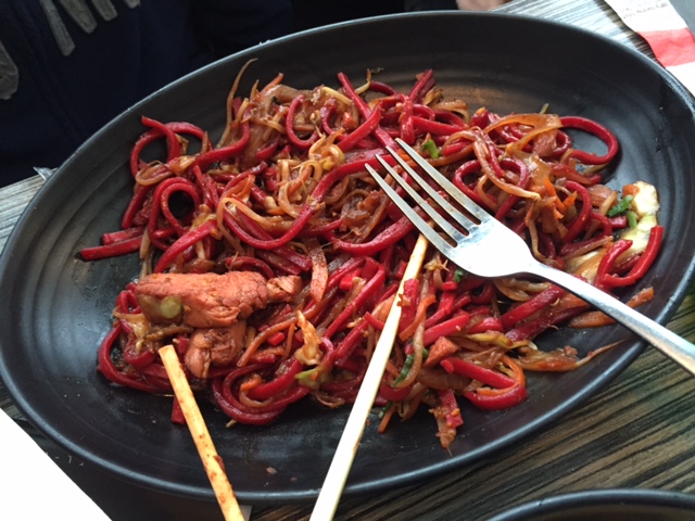 עשן אדום – אטריות ביצים אדומות (לא חריף) עם פרגית מעושנת, נתחי עוף, כרוב, נבטים, גזר ובצל סגול, כיכב כאן, למעשה זו המנה האהובה עלי, רק שהיא לא נטולת גלוטן.