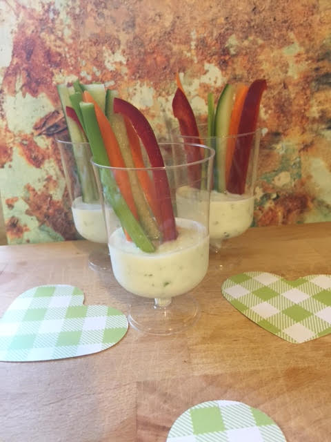 שופכים שליש או קצת פחות ציזיקי לכוס אישית. לבפנים מכניסים כ 8 מקלות של ירקות