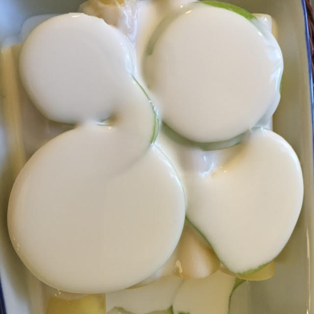 ממלאים את הקנלוני בגבינה ומניחים על התפוחים בתבנית. מעל מוסיפים שכבה של תפוחים נוספת. שופכים את השמנת המתוקה על הקנלוני ואם התבנית גדולה מדי הוסיפו טיפה מיים רותחים, כרבע כוס.