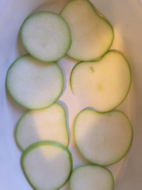 חותכים את התפוח לחתיכות דקות ומרפסים את התבנית