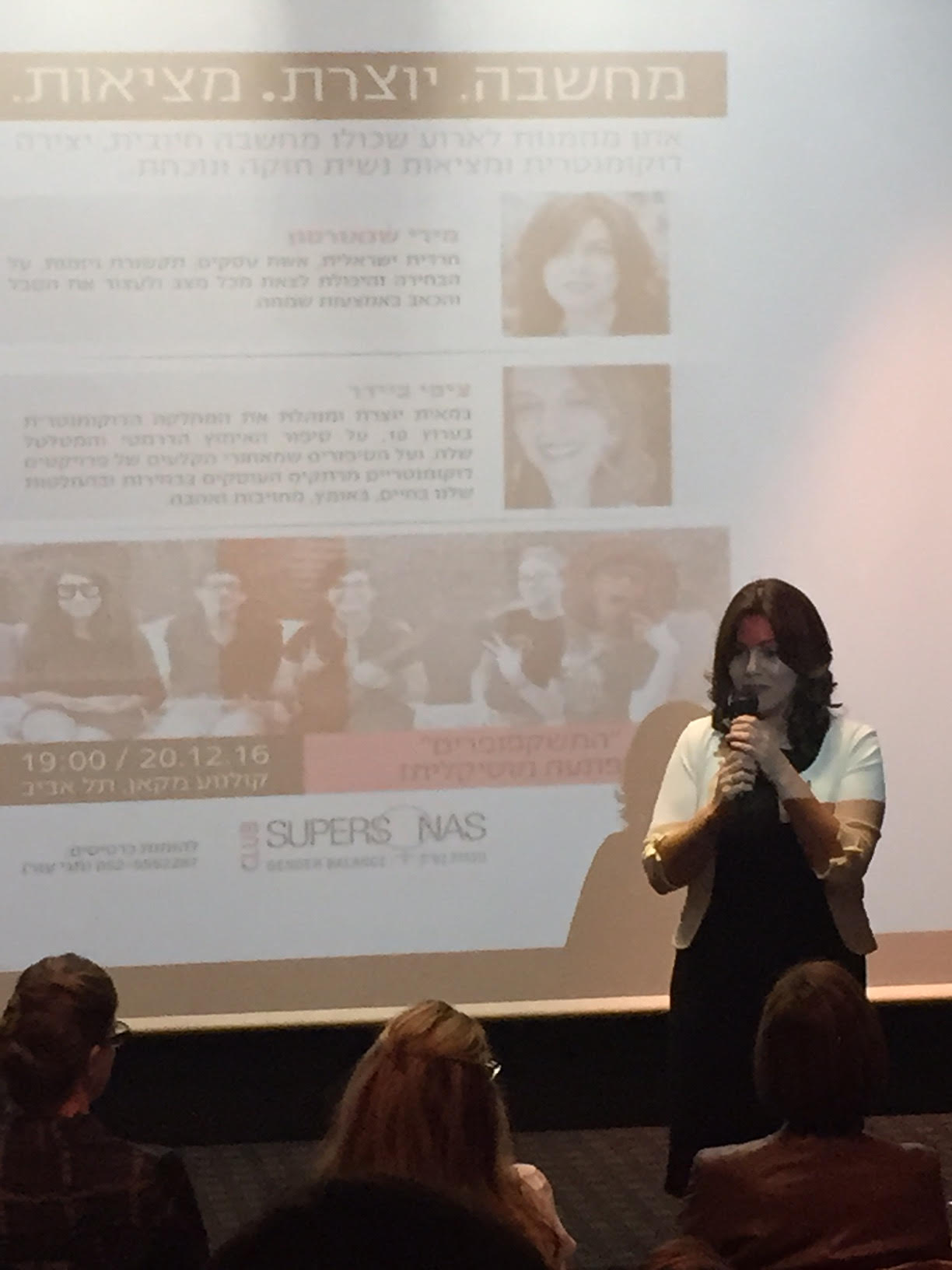 בשבוע שעבר הצטרפתי לאירוע נשים של סופרסונה. מדובר בקבוצת נשים מובילה שהחליטה ביום האישה לפני כשנה וחצי להקים מיזם שיפעל לאור חזון של יצירת נוכחות נשית שוויונית ומאוזנת בצמתי השפעה והחלטה בישראל: בכנסים, בדירקטוריונים, בפאנלים ובשדרות הניהול במשק ובחברה. כיוון הפעולה: צדק מגדרי יוביל חוסן כלכלי וחברתי בארץ ובעולם.