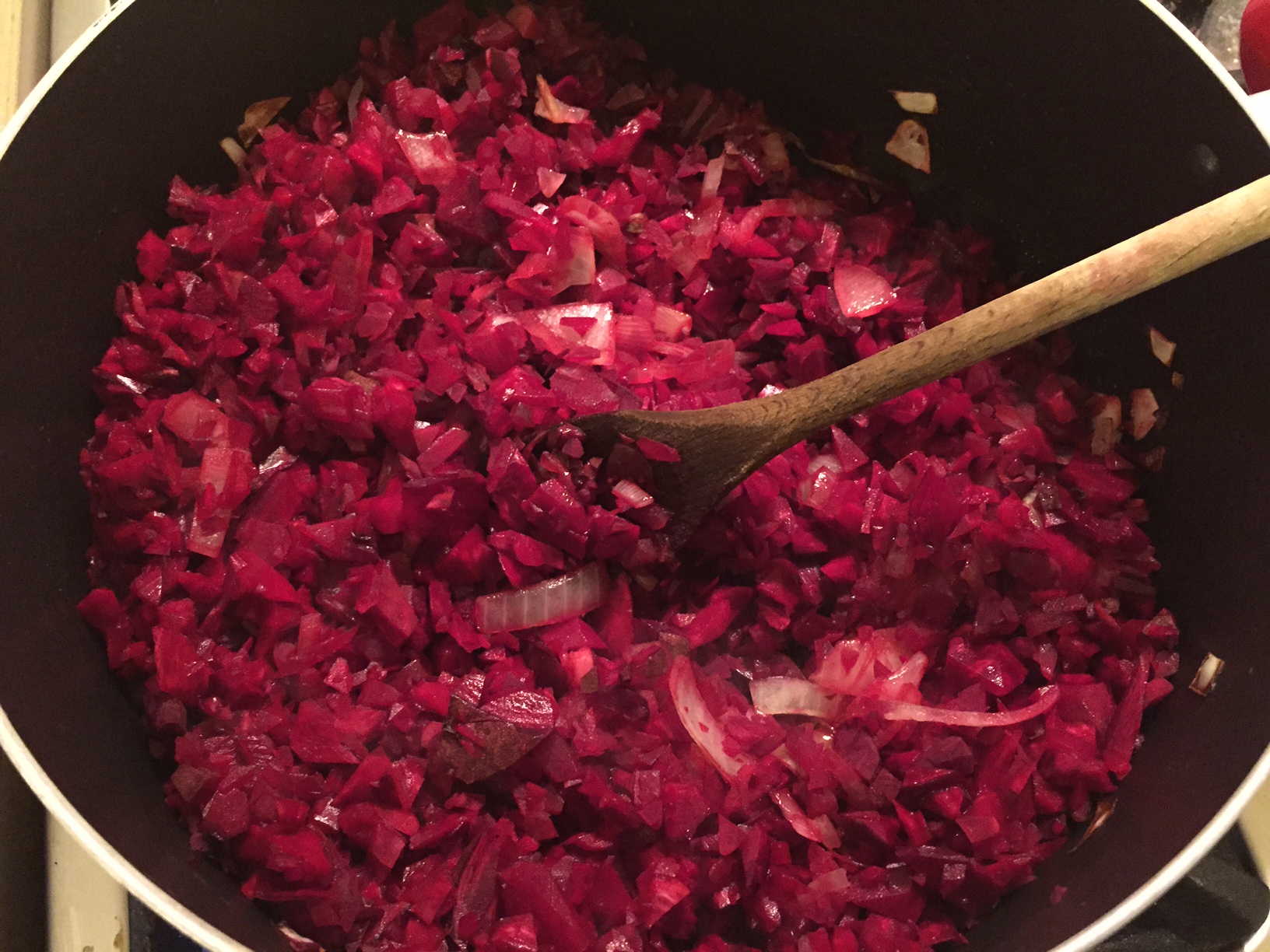 מוסיפים את הסלק החתוך דק ומאדים עוד כמה דקות עם הבצל